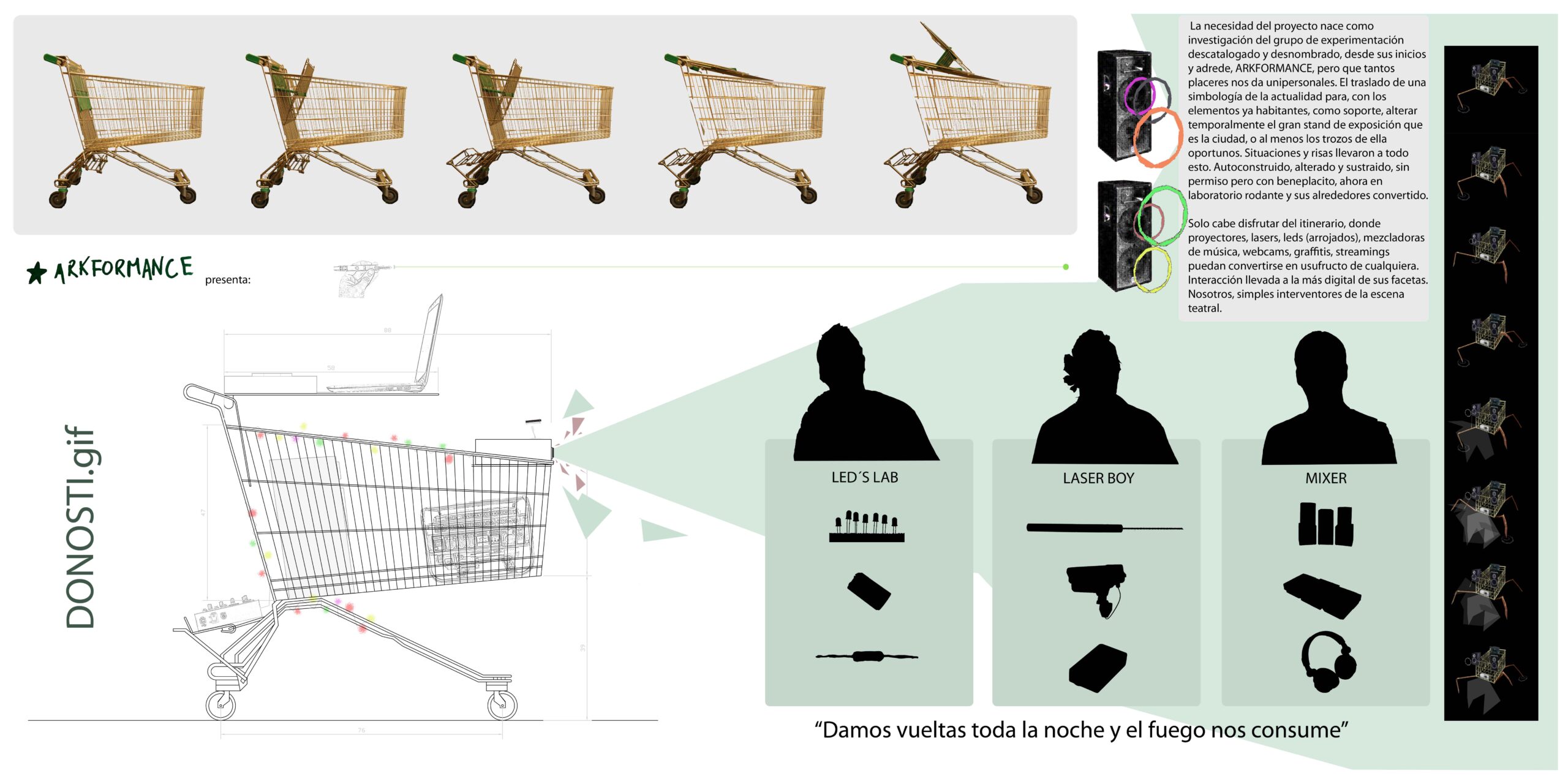 Arkformance fue un colectivo que surgió en el año 2007 y estuvo en cierta actividad hasta 2012, como un vómito directo de algunos compañeros de la Escuela Técnica Superior de Arquitectura de Sevilla (ETSAS). Desde la militancia estudiantil y a través de la generación de instancias de intervención artística abiertas a la participación activa en la calle, nos encontramos traduciendo a nuestros modos precarios intelectuales, aquellos libros que llegaban sobre revoluciones perdidas y la producción de situaciones vivas. Sabíamos que las herramientas en formación en arquitectura nos acortaba el campo experimental, porque era aburrida, porque era cerrada, porque le costaba entender su lugar como producto de lo común, pero sobre todo porque carestía de cualquier reflexión crítica sobre su complicidad de los peores ejercicios del poder de los que habíamos sido testigos. Lxs arquitectxs debían servir de herramienta contra las legitimizaciones especulativas, acompañando los procesos activos de resistencia, en las ocupaciones de centros sociales, espacios públicos y viviendas.