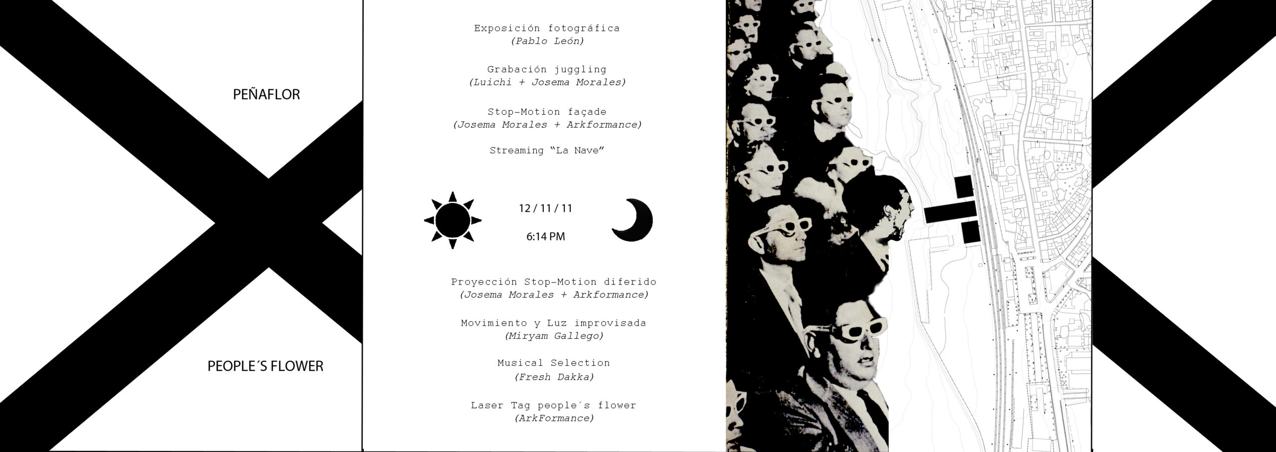 PEOPLE'S FLOWER: en el marco de la investigación sobre el edificio de la antigua Fábrica de Tejidos de Yute en Peñaflor (Sevilla) para un cierto Trabajo Fin de Carrera, nos propusimos generar un encuentro en las instalaciones de la fábrica para todas aquellas personas que quisieron utilizar este gigante olvidado como soporte para una crítica de su propia situación. Ante la incapacidad proteccionista, ya el docomomo había sufrido el intento nulo de su preservación, nos agarramos a la idea memorial de generar un último registro festivo.