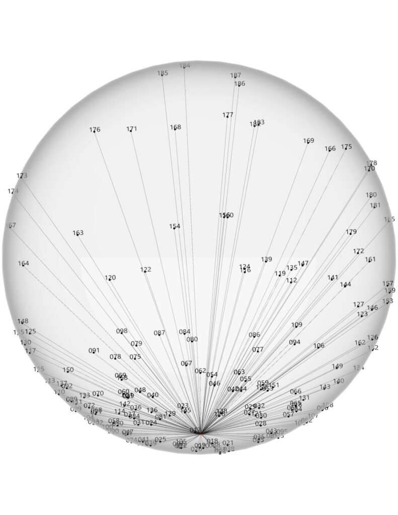 01. el ecuador y la distribución de los capítulos como nuevos puntos sobre el eje de la esfera, basados en un remapeo de aquellas distancias en escalas de «10».