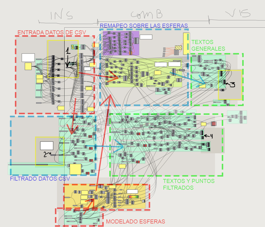 Dejo por ultimo un pantallazo por grupos de acciones, del código interno de la herramienta de programación (rhinoceros + grasshopper), y un relato en 4 pasos del proceso de «esculpido»