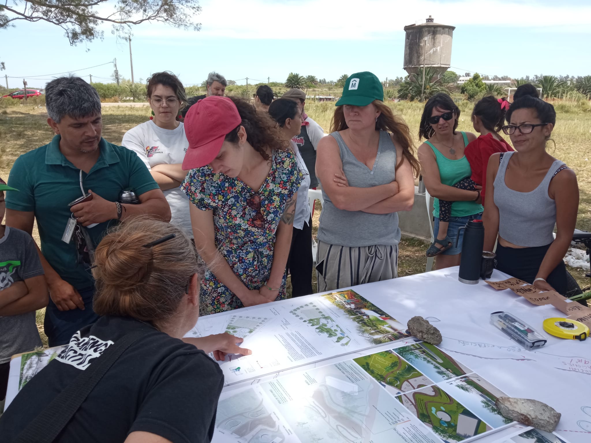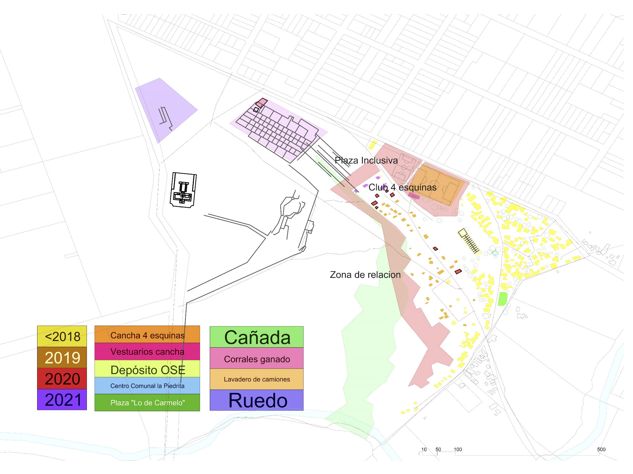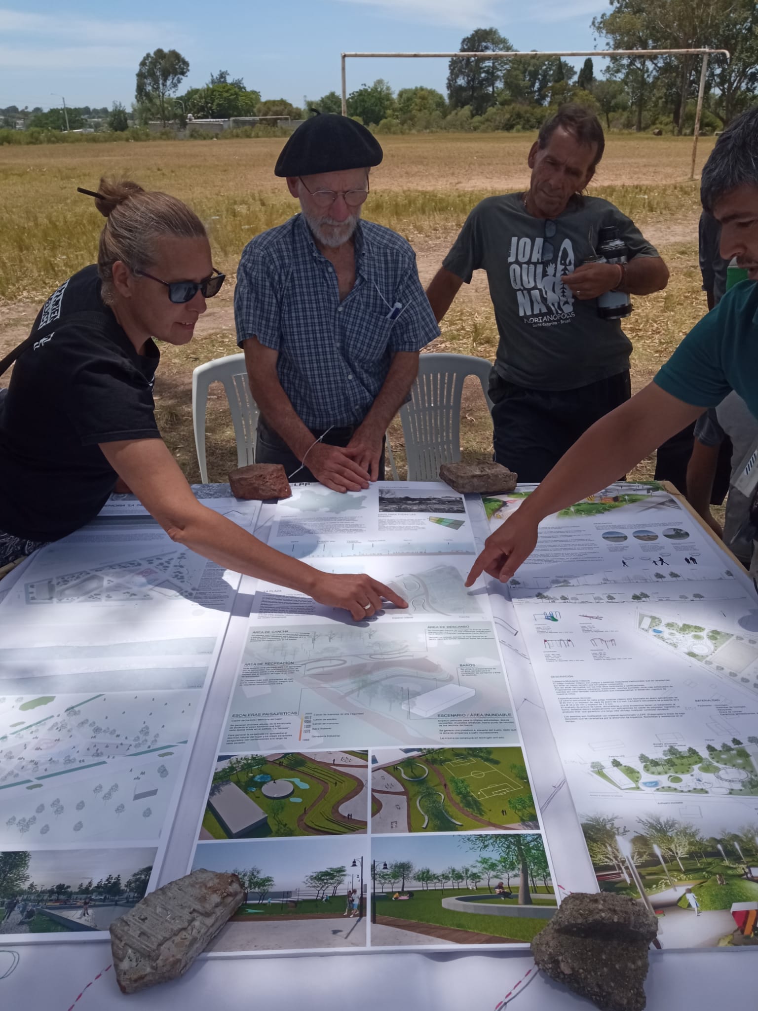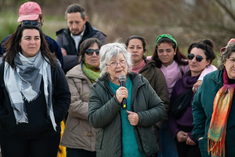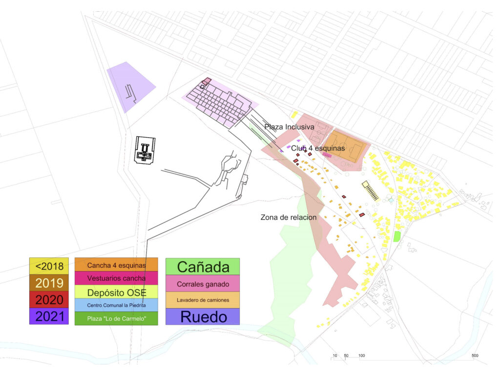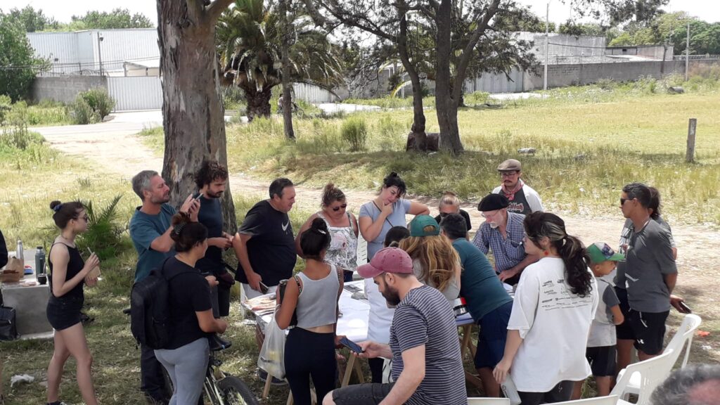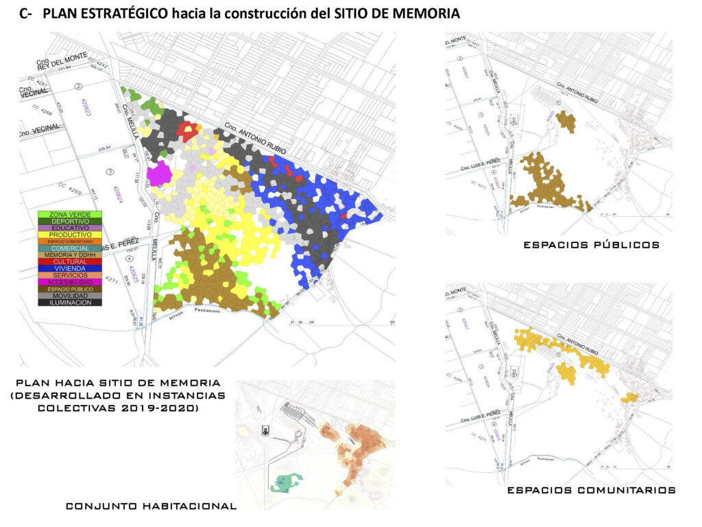 Sus condiciones de interpolación y vacancia hicieron de este sector del territorio del sitio de memoria, un recurso fuertemente tensionado, tanto por la demanda colectiva que planteaba su incorporación como activo equipado para el barrio, como para una privatización a partir de su colmatación por nuevas viviendas. La situación de pugna territorial se resolvió en un acto de dos movimientos. El primero – constitutivo – consistió en la coordinación de un grupo de trabajo dentro de la mesa “Barrio” de la Comisión de SM, con el objetivo de generar un proyecto de espacio común para presentar a finales del 2021 a la convocatoria de los Presupuestos Participativos (PP) 2022-2023 de la Intendencia de Montevideo. El segundo – performativo – a través de una acción situada sobre el lugar destinado a la plaza, protagonizada por CO.ME.TA, representantes de la INDDHH y algunas vecinas de estos barrios, que retiraba explícitamente los parantes y tejidos que habían aparecido en ese sector unos días antes, a suerte de delimitación oficiosa para loteo inmobiliario.