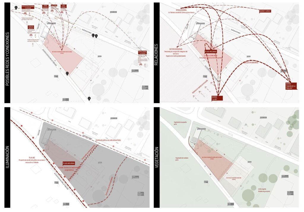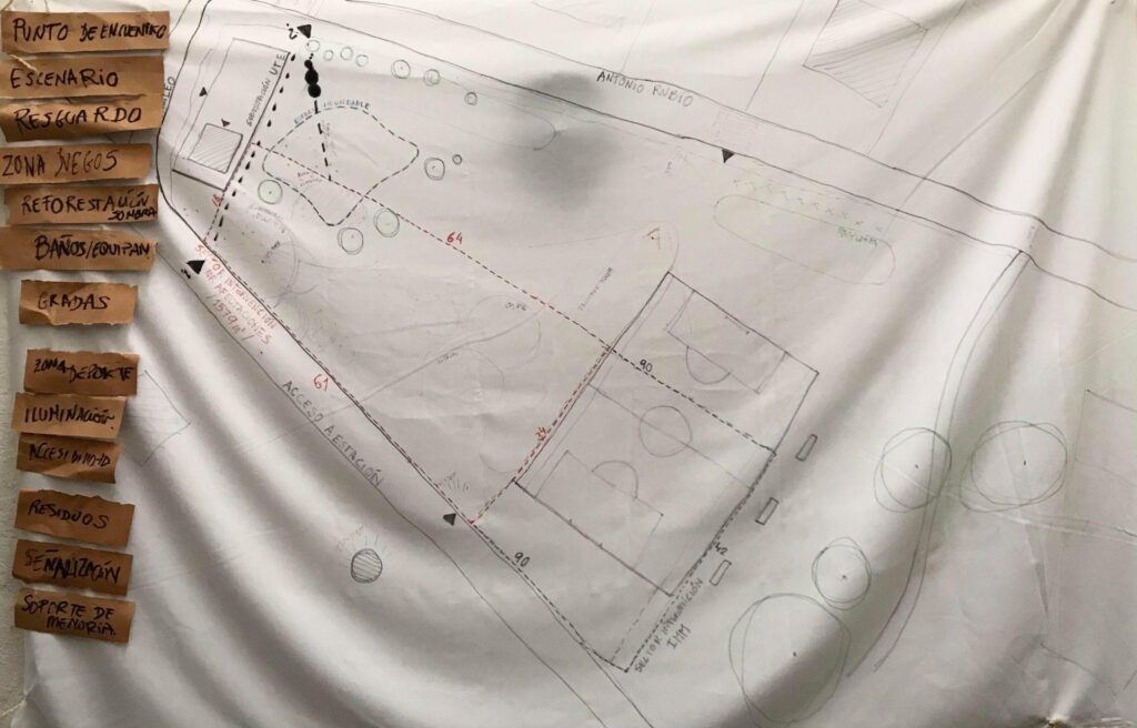 Del primer intercambio entre vecinas y vecinos, se instalaron el conjunto de demandas para la plaza, que terminaron de adjetivar su factor de inclusividad. En lugar de establecer un programa específico, en la sistematización – desarrollada por los estudiantes del Seminario Memoria Territorio e Integralidad (SMT&I) – las necesidades se agruparon en “entornos” programáticos. La plaza como “entorno memorial”, receptivo de marcas y homenajes; “entorno incremental”, modulado para su crecimiento en el tiempo; “entorno comunitario”, que pudiera incorporar espacios de reunión coordinados por el barrio, extendidos de la vivienda particular; “entorno seguro”, para ser transitado y socializado especialmente por las mujeres de la zona; “entorno accesible”, universal e integrado a las dinámicas existentes. Lxs estudiantes del Laboratorio de Proyecto Participativo (LPP) tuvieron que abordar esta sobredimensión programática y traducirla en áreas multifuncionales. El requisito presupuestal para los PP es limitado por lo que las exploraciones proyectuales también tuvieron que ceñirse a sus condiciones materiales.
