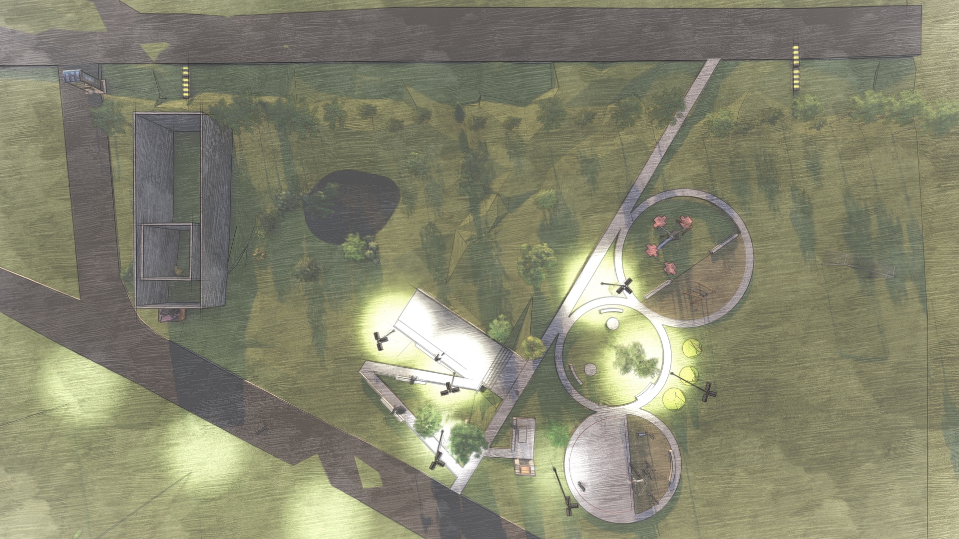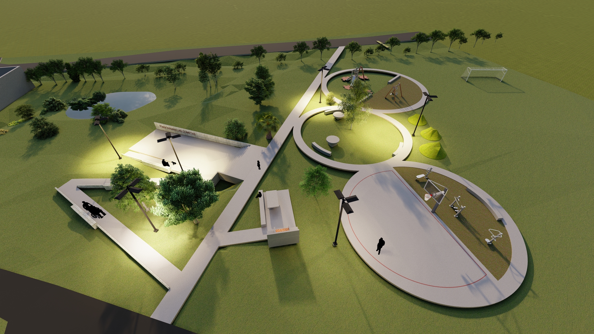 El diseño final de la Plaza Inclusiva “Las Cometas” es una compleja confluencia de formas superpuestas, tensionadas por la visión de los estudiantes, de la expresión colectiva, y otras metodologías de composición in situ desarrolladas en los mapeos, que acabaron desembocando en cierta propuesta que logramos pasar a limpio. El valor quizás no está en si la plaza supo dar respuesta a todas las demandas de su diseño, teniendo en cuenta las fuertes condicionantes presupuestales, sino bajo qué modelos fue producido este espacio comunitario que finalmente pudo ser, y si esto podría potenciar la capacidad de apropiación del barrio en tanto formaron parte activa del proceso, en un entorno tan socialmente crítico como el SM La Tablada.