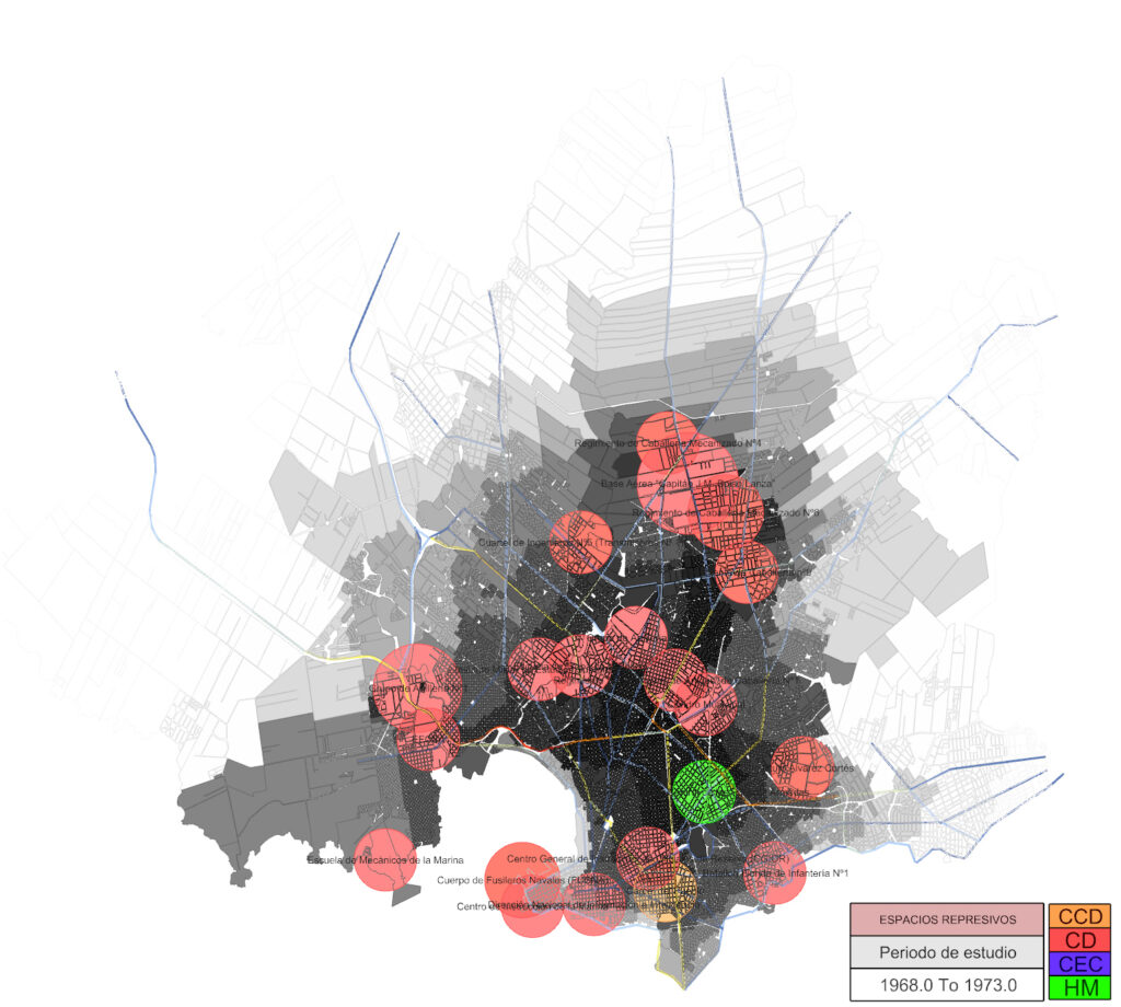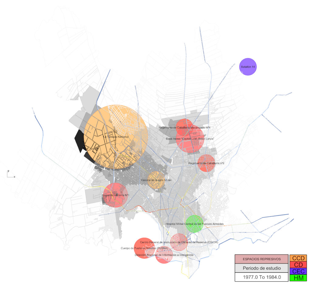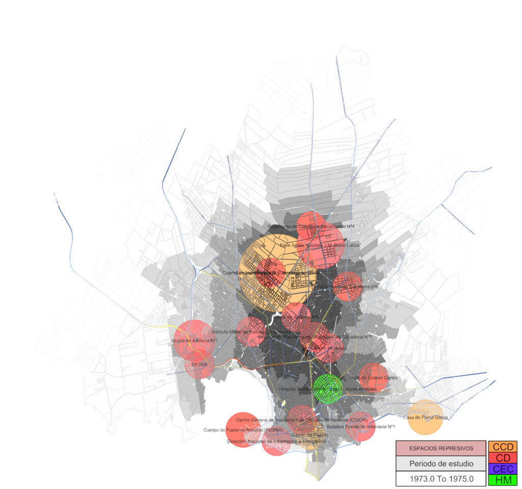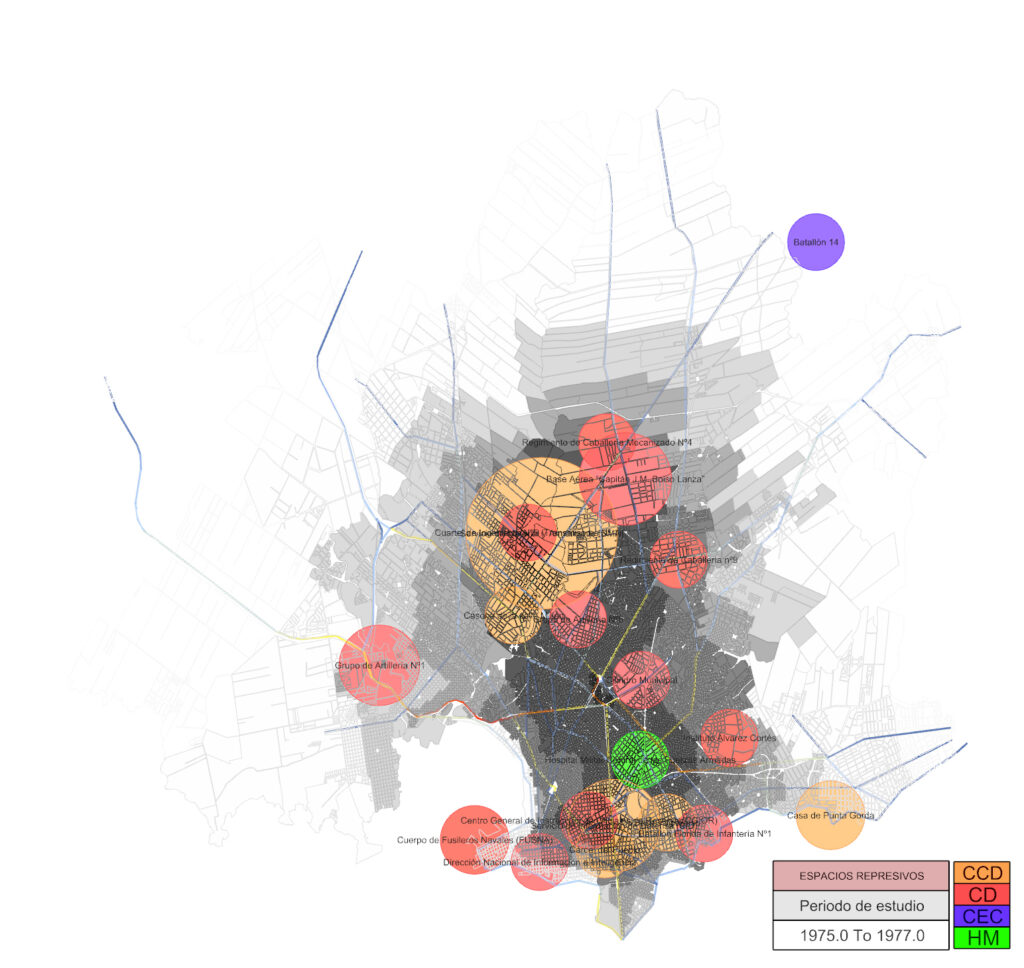 Desde el análisis multiescalar acotado al periodo represivo desde 1968-1985, se trabajo – entre otros abordajes – en la produccion de cartografías que dieran cuenta de la afección de los Centros Clandestinos de Detención y Tortura (CCDyT) hacia sus afueras.