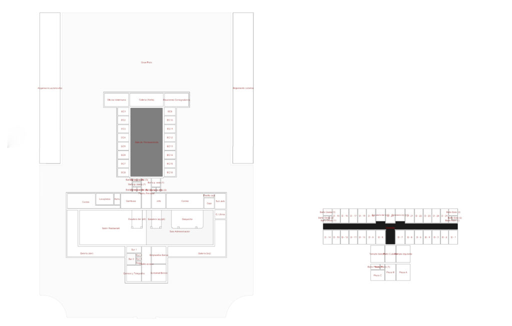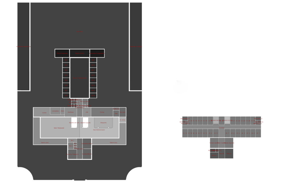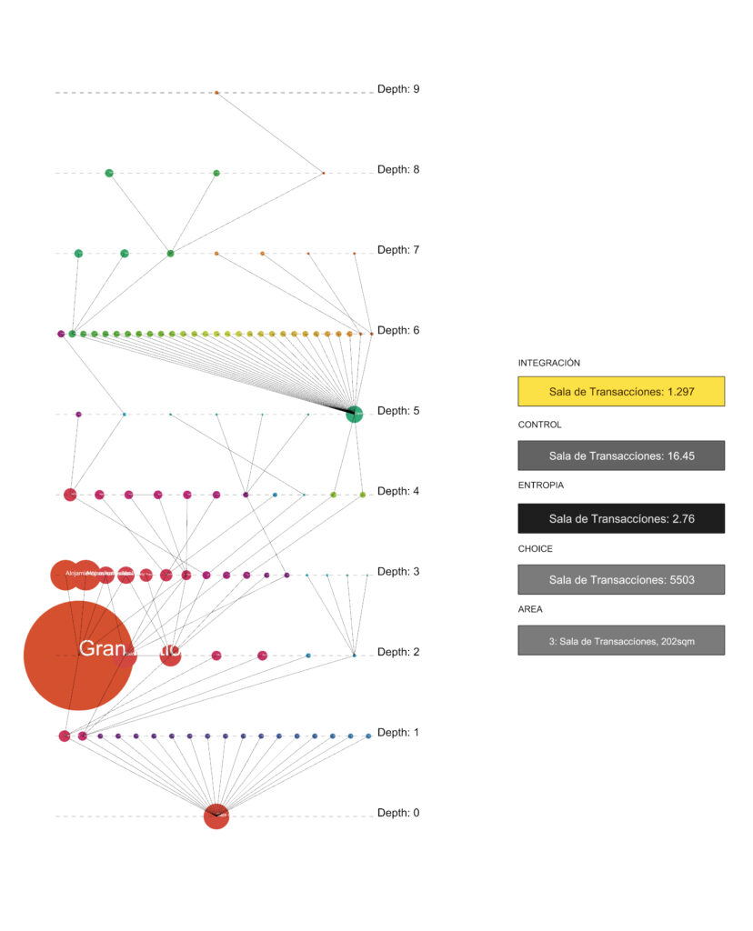 Desde la escala edilicia (micro) se desarrollaron un conjunto de análisis sobre la configuración espacial del modelo relevado del edificio y aplicando las propuestas teóricas de Hillier y Hanson en The social logic of space de 1984. De esta manera podíamos componer un estado de transición de cada uno de los espacios interiores utilizando como fuente primaria los usos del espacio que aparecían en las entrevistas. ¿En qué medida los valores de control/entropía/elección/interacción de las partes del edificio a priori fueron condicionantes para la operativa represiva? ¿Cómo las jerarquías espaciales se aprovechaban para los sentidos de clandestinidad y ocultamiento? ¿Cómo estos factores espaciales posibilitaron también la aparición de procesos de resistencias de los/las secuestrados/as?