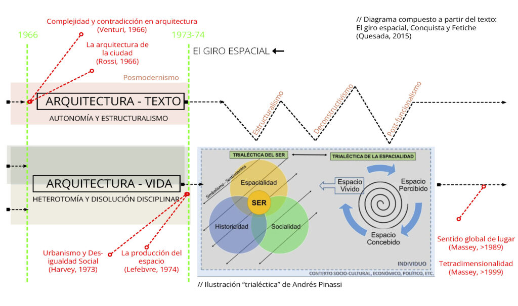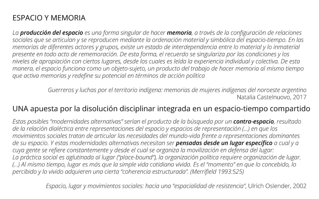 El cambio epistemológico traído desde el giro espacial hacia las ciencias sociales (Soja, 1996) y la arquitectura (Quesada, 2016), se ha visto profusamente aplicado en la última década para el análisis sobre pasados y presentes violentos en América Latina (Schindel y Colombo, 2014; González y Salamanca, 2019; Schindel, 2013; Fabri, 2016). Estos enfoques han posibilitado resaltar el relacionamiento que existe entre las violencias patrocinadas por los Estados y la producción social del espacio, y cómo esto influye en las memorias, los imaginarios y las prácticas sociales (Shindel y Colombo, 2014). Estudiar las espacialidades de la violencia estatal y la excepción (Agamben, 1998) implica considerar las subjetividades producidas mediante estos procesos violentos, las diversas formas en que actores y grupos recuerdan y disputan significados sobre lo acontecido (Jelin y Langland, 2003), los efectos y afectos que emanan esas materialidades (Navarro-Yashin, 2013) y las maneras de vivir y usar los espacios como partes integrantes de los paisajes modificados por la violencia.